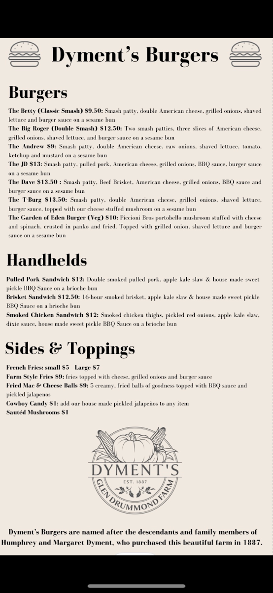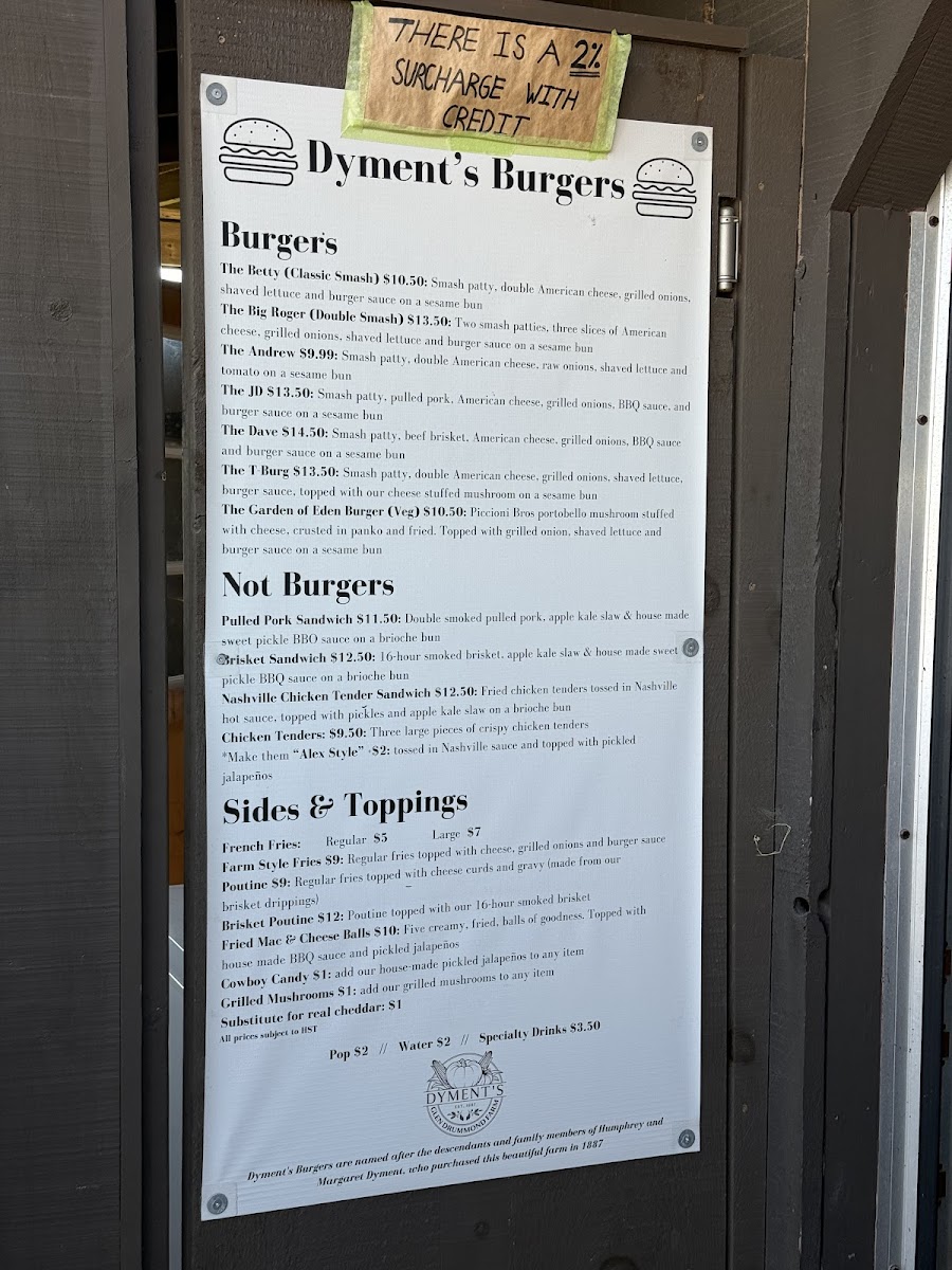 A Hidden Gem Worth the U-Turn! We made a spontaneous U-turn after spotting the Dyment’s sign, and honestly—it was the best decision of the day. The place has this welcoming, rustic charm that immediately sets a relaxed tone, with beautiful open views and cozy outdoor seating (those iconic red chairs are practically calling you to sit down and stay awhile). But let’s talk about the star of the show: the burger. Absolutely incredible—juicy, perfectly cooked, and packed with flavour. It’s the kind of burger that reminds you why farm-fresh ingredients make all the difference. Everything tasted fresh and well-prepared, like a homemade meal turned gourmet. The staff were incredibly friendly and down-to-earth, making the whole experience even better. You can tell they care not just about the food, but about making visitors feel welcome. Plus, the surrounding area is great for stretching your legs or playing a bit of mini golf while taking in the gorgeous countryside. Whether you're a local or just passing through—make the stop. You won’t regret it. Highly recommended!